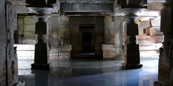 The maha-mantapa leads to the three-aisled ardha-mantapa, the large cubical pillars of which are also of an early type, with cubical base, octagonal shafts, a thin pionted kumbha and large idol. The Kalyanamantapa is ornate and was built during the l5th century.