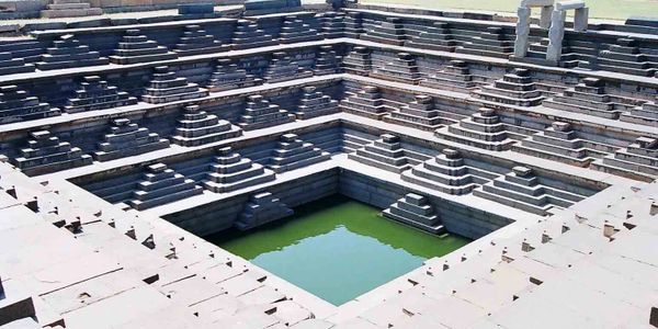 Hampi abounds in water channels and water tanks, a telling testimony to the engineering skill, which had been achieved. The building is a large square structure, remarkable for the contrast between its plain exterior and the very ornate interior. The bath is 15m square and 1.8m deep and surrounded by delicately decorated arched corridors and projecting balconies. The carved stucco ornamentation on the ceilings and vaults above each of the arched bays is characteristic of Islamic architecture. It is truly a bath for a queen, discreet in its outer appearance and rich and elaborate in the enclosed inside.