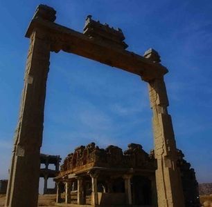 To the southwest of Vijayavitthala Temple, one can find the monument popularly known as the King's Balance. where kings were weighed against grain, gold or money which was then distributed to the poor. Also known as Tula Bhara or Tula Purushadana, it consists of two lofty carved granite pillars about 15 feet high supporting a stone beam about 12 feet, provided with three hoops on the underside. One of the pillars has a bas-relief depicting a king and two queens, possibly Krishna Deva Raya and his consorts.